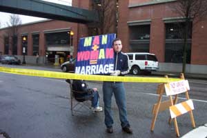 It's almost 10am... Damn there are lots of reporters here. | The gayest looking anti-gay protester. |