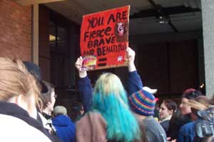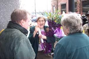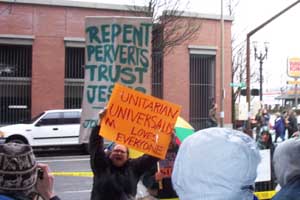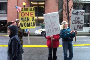 This woman is authorized to marry people--and performed marriage ceremony in front of the building for gay couples non-stop. There were couple of other clergies on the site volunteering to perform marriage as well. | That military man is scary. And here are the only two female protesters. Someone please point out that, from today on, gay men can have "real" husbands too. |